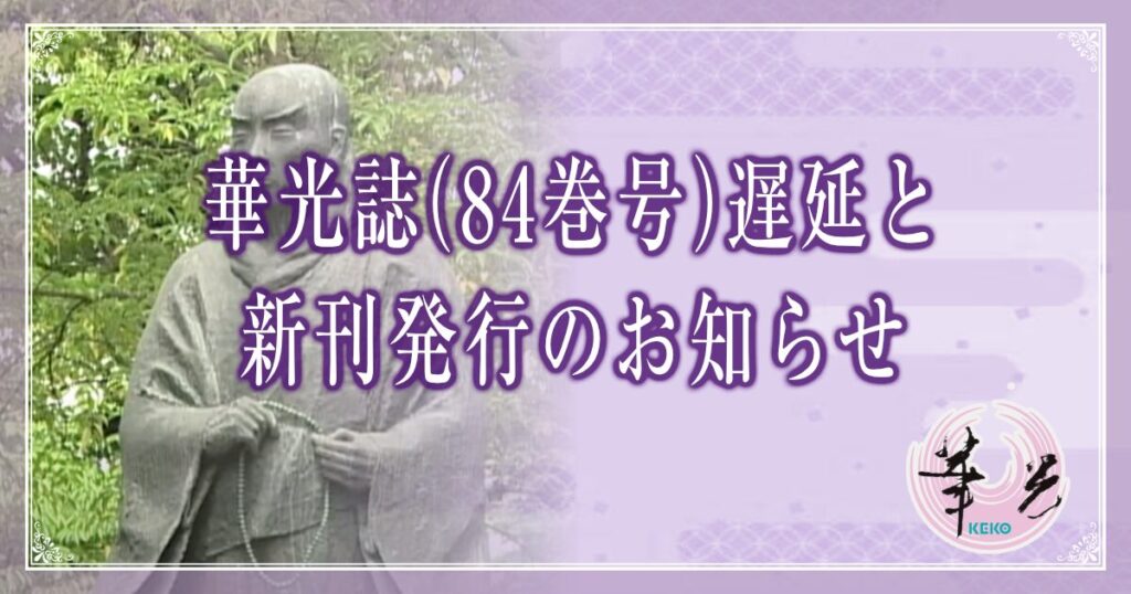 - 華光誌(84巻4号)遅延と新刊発行のお知らせ合掌 慈光照護のもと、ますますお念仏ご相続のことと存じ上げます。 さて、令和7年10月1日に発行予定でした華光誌(84巻4号)の発行が遅れておりますことを深くお詫び申し上げます。 次号は、通常号の華光誌ではなく、昨年 […]